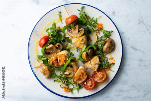 Turkey skewers with mushrooms and vegetables. Top view table.