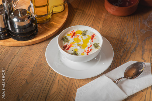 Türkische Joghurtsuppe mit Reis und orientalische Gewürze