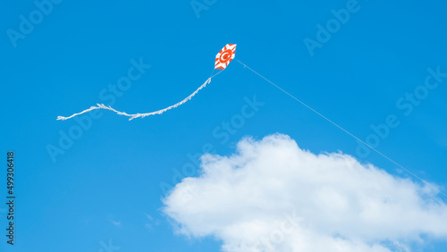 Turkish flag kite on the blue sky. 23 April Turkish flag kite. Kite flying in the blue cloudy bright sky.
