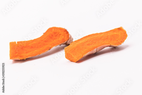 Turmeric root with slices isolate on white background .