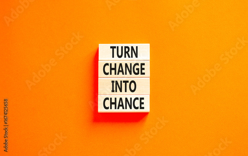 Turn change into chance symbol. Concept words phrase Turn change into chance on beautiful wooden blocks. Beautiful orange paper background. Business Turn change into chance concept. Copy space.