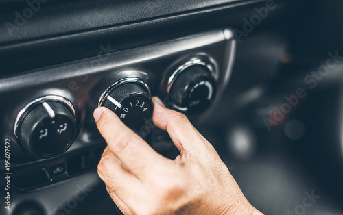 Turning on car air conditioning system,finger hitting car emergency light botton,Hand tuning fm radio button in car panel.