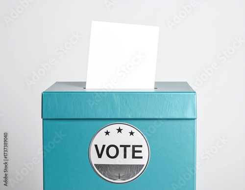 Turquoise ballot box with "VOTE" sticker, receiving a white paper slip