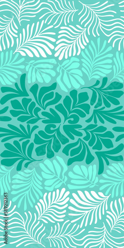 Turquoise gradient abstract background with tropical palm leaves in Matisse style. Vector seamless pattern with Scandinavian cut out elements.