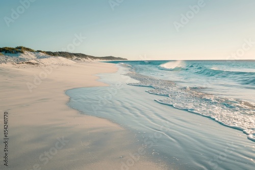 Turquoise sea waves crashing on idyllic sandy beach at sunset