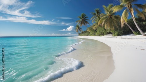 Turquoise waters gently lap against the serene sandy beach under a clear blue sky in a tropical paradise