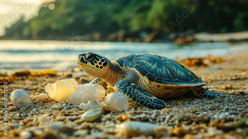 Turtle laying plastic eggs on polluted beach environmental awareness nature photography coastal region close-up conservation message