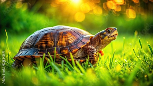 Turtle on the Grass: A Close-Up of Nature's Calm Reptile in a Green Landscape, Capturing the Beauty of Wildlife and Serenity in a Natural Setting