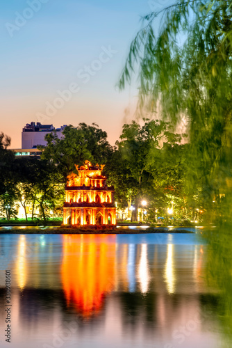Turtle Tower in the center of Hoan Kiem Lake(Lake of the Returned Sword) framed by trees. This tower is a popular tourist attraction in Hanoi, Vietnam