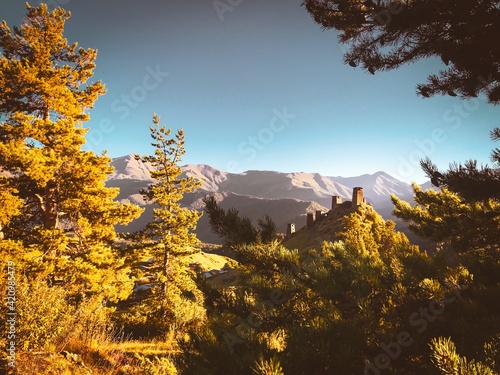 Tushetian towers up hill in Upper Omalo, Tusheti. Georgia travel and culture