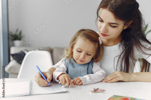 Tutor with pupil. Little girl studying. Private lesson. Mother helps her daughter.