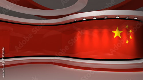 TV studio. Red background. China flag studio. China flag background. News studio. The perfect backdrop for any green screen or chroma key video or photo production. 3d render. 3d