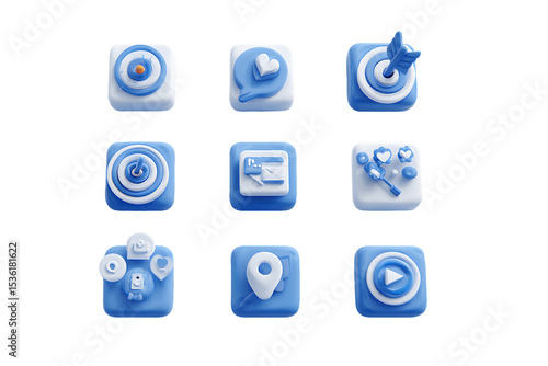 Twelve 3D Rendered Social Media and Marketing Icons on Transparent Background, PNG