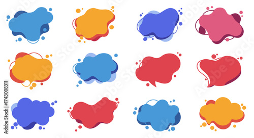 Twelve abstract colorful blob shapes are arranged in a 3x4 grid on a white background