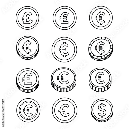 Twelve Black and White Currency Coin Icons Euro Pound Dollar Symbols Line Art Design Elements coins Vector Illustration for Design, Business, and Stock Platforms