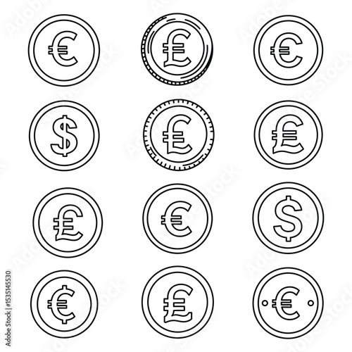 Twelve Black Line Art Currency Coins Euro Pound Dollar Symbols White Background vector Vector Illustration for Design, Business, and Stock Platforms