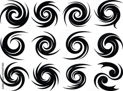 Twelve Black Spirals with Varying Shapes and Rotations on a White Background