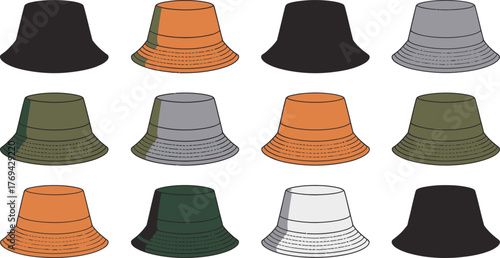 Twelve Bucket Hats in Black, Orange, Olive Green, Grey and White Color Palette Displayed