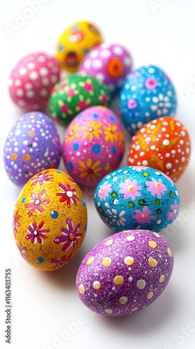 Twelve colorful hand-painted easter eggs forming a square on white background