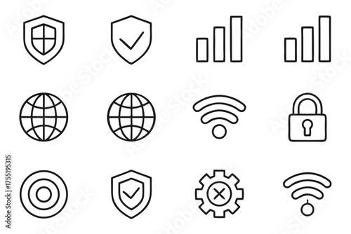 Twelve outline icons for security, connectivity, and technology concepts shield protection