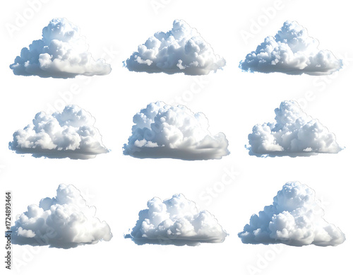 Twelve stylized cumulus clouds, various shapes and densities, isolated on black background