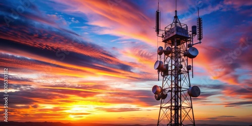 Twilight hues enveloping a communications tower laden with antennas, twilight, hues, communications tower, antennas