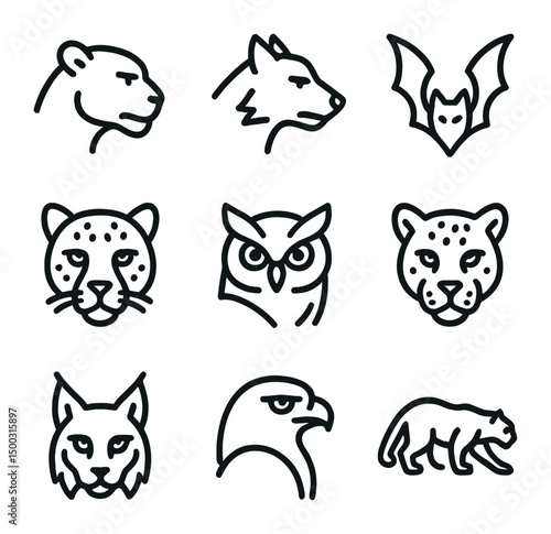 Twilight Predator Icons. Outline icon set of twilight predators: Shadow Panther, Dusk Wolf, Nightstalker Bat, Moonlight Jaguar,