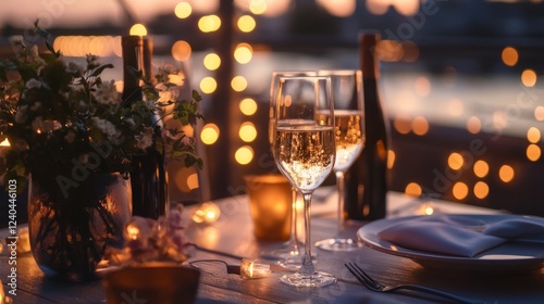 Twilight rooftop oasis with cozy seating, elegant dinnerware, and sparkling wine glasses reflecting the city lights.