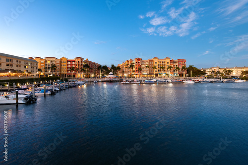 Twilight settles on Naples with waterfront buildings and boats under a clear sky.