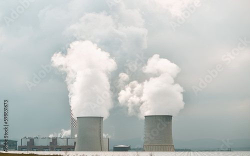 Twin nuclear power stacks rise above. A power plant in Europe.