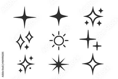 Twinkle Star Icon Set with Black Starburst, Sparkle, Glow, Radiant Sun and Shining Effects for Decorative Design, Abstract Vector Elements, Ideal for Highlight, Emphasis and Web Graphics