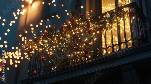 Twinkling fairy lights strung across a New Yeara??s balcony, creating a lively atmosphere.