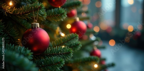 Twinkling lights adorn evergreen branches with ornaments, festive atmosphere, ornamental decor, holiday decorations