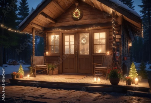 Twinkling lights and festive decorations in front of a cozy cabin, cozy cabin, twinkling stars