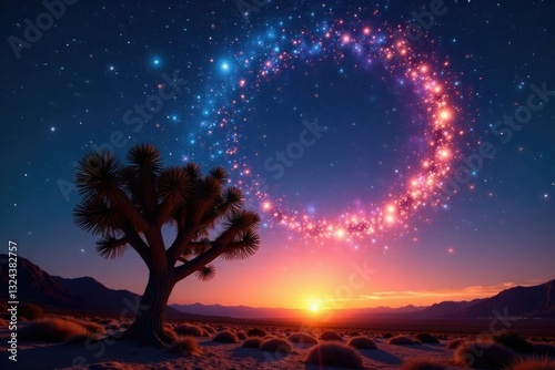 Twinkling stars form a swirling vortex above a desert tree's foliage at sunset, desert, sunset, light show