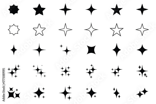 Twinkling stars, star icons vector set. Sparkle stars vector icon. Christmas vector symbols isolated on white background. Different black sparkles icons. Vector illustration.