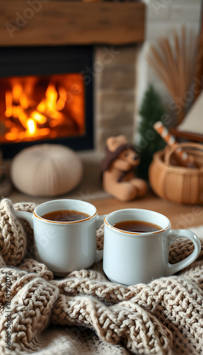 Two mugs for tea or coffee, woolen things near cozy fireplace, in country house, winter vacation, horizontal, mindfulness theme. with white shades
