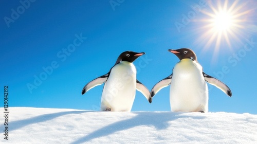 Two Adelie Penguins Standing on Snowy Hill Under Bright Sunlight Against Clear Blue Sky in Antarctica