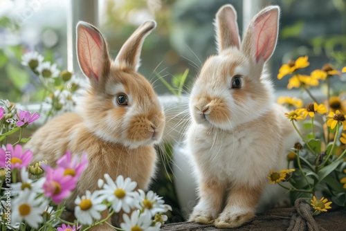 Two adorable fluffy bunnies sitting amidst vibrant spring flowers, a delightful springtime scene.