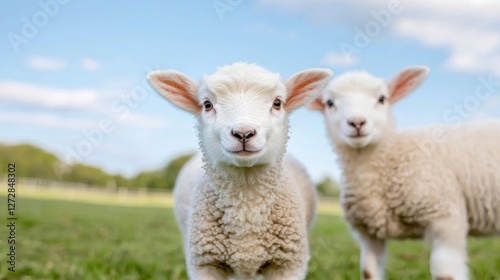 Two adorable lambs in a grassy field on a sunny day. Potential use Children's book illustration, nature photography, educational material