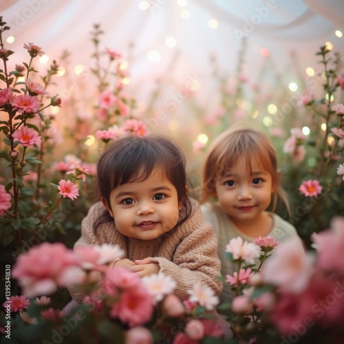 Two Adorable Little Girls Posing Among Pink Flowers and Fairy Lights