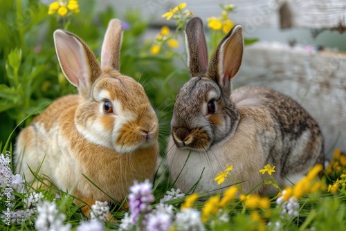 Two adorable rabbits, one brown and one gray, nestled together in a vibrant spring meadow.