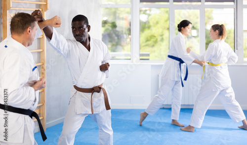 Two adult male karatekas in kimonos practice karate techniques in group in gym
