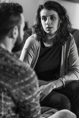 Two adults engaged in a deep conversation, seated comfortably indoors.