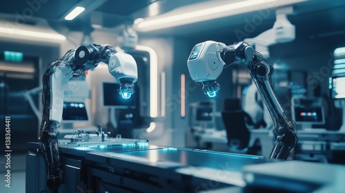 Two advanced robots collaborating on a table in a state-of-the-art futuristic hospital for enhanced patient care