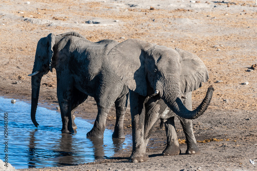 Two African Elephants -Loxodonta Africana- drinking from a waterhole. Etosha National Park, Namibia.