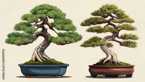 Two Artistic Bonsai Trees in Pots. Detailed Illustration of Miniature Plants, Traditional Japanese Horticulture, and Serene Beauty.