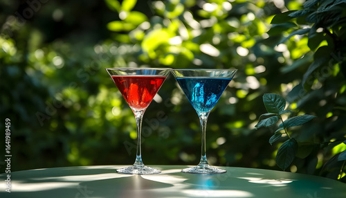 Two artistic glasses filled with red and blue alcoholic cocktails stand on the table against the backdrop of a lush green garden, close-up. Playful summer atmosphere for creative cocktail concepts