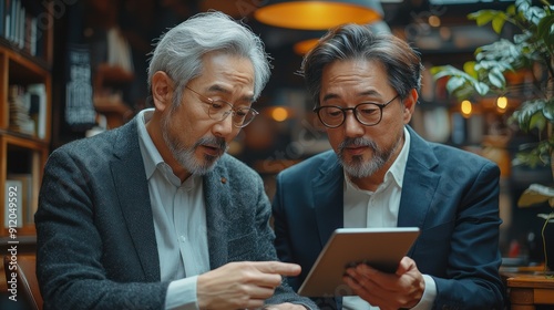 Two Asian business partners brainstorming ideas while looking at a tablet