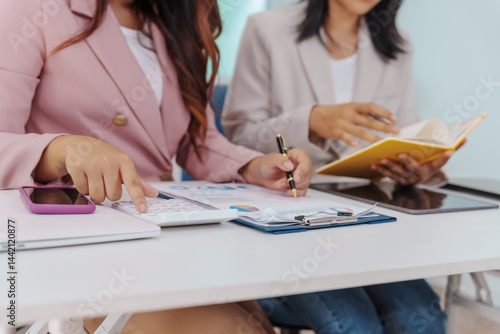 Two Asian businesswomen working together at a desk, focused and professional. They collaborate on tasks, share ideas
